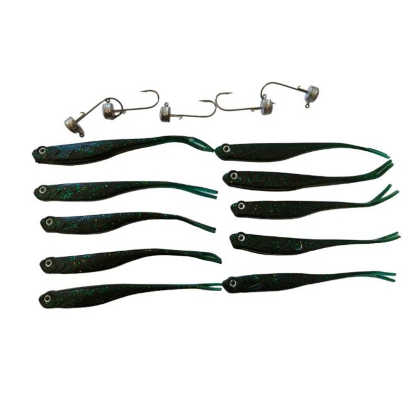 What's up for grabs? 10pcs MasterPro 13cm, 8.5g Dark Green With metallic points Fork Tail minnow lure +5pcs jigheads Features include: The MasterPro 13cm, 8.5gram Dark Green With metallic points Fork Tail minnow designed for night, deep or murky waters has