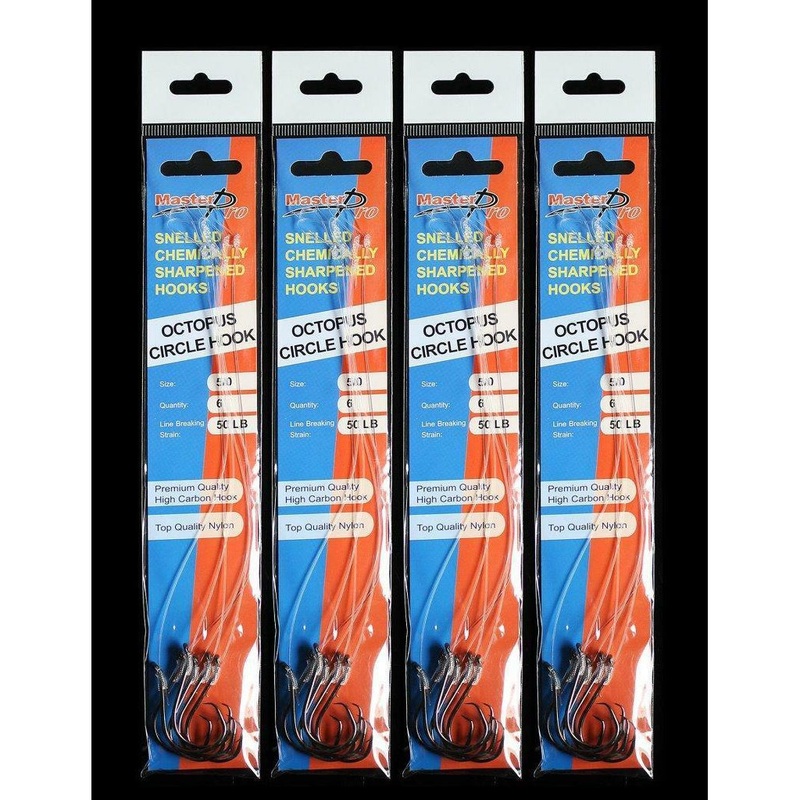 What's up for grabs? 4 Packs Of 6, Masterpro Pre Tied / Snelled Octopus Circle Hooks Size 5/0-6/0What's up for grabs? Features include: Make your life easy when the bite is hot. Don't waste time re rigging when you loose a hook or scuff up your leader. Gra
