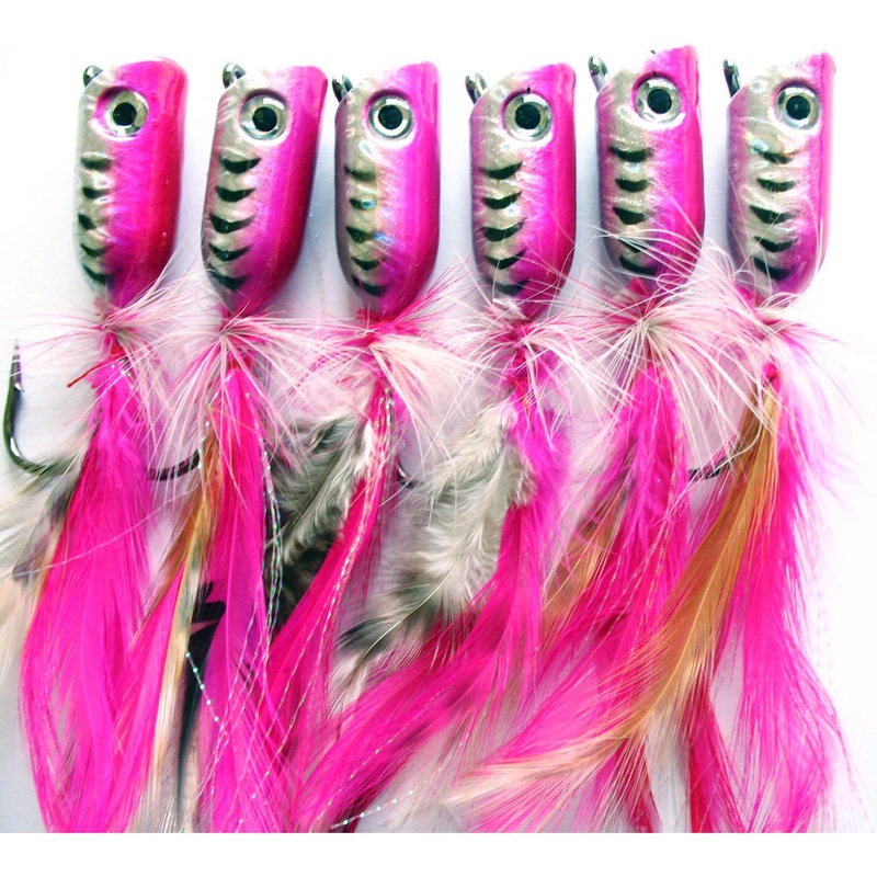 6 X Quality Huge Surf Poppers Fishing Lure On Exciting Red Colour With 3D Eyes You are buying 6pcs new exciting laser Red coloured huge size surf poppers with 3D eyes. These surf poppers' features are: Premium quality foam body with natural feathers New ex