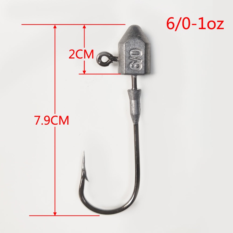 Size: The hook is as size 6/0. Weight: It weighs 1 ounce. Dimensions: The total length of the hook is approximately 7.90 cm. The lead head length is about 2 cm. Design: It has a pointed lead head that aids in rapid sinking, making it suitable for reaching
