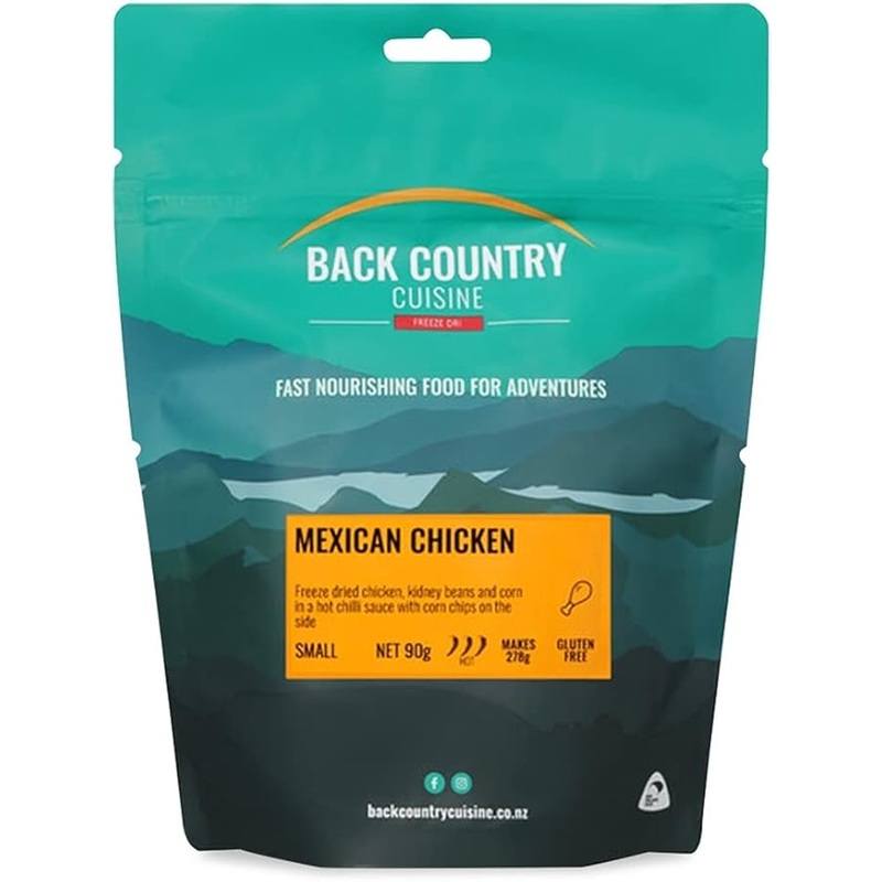 This meal is light to carry and provides tasty, fast nourishing food for adventure with freeze dried chicken, kidney beans and corn in a hot chilli sauce with corn chips on the side.Benefits: Light the pouch weighs one third of the meal it makes Fast ready