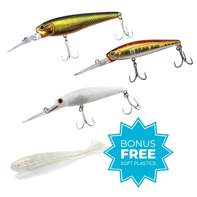 This Barramundi Lure Pack is the perfect mix of lures for targeting Barra. It has a mix of floating and sinking options each with their own unique features that attract Barra in different ways, plus a bonus FREE pack of soft plastics that they love too.