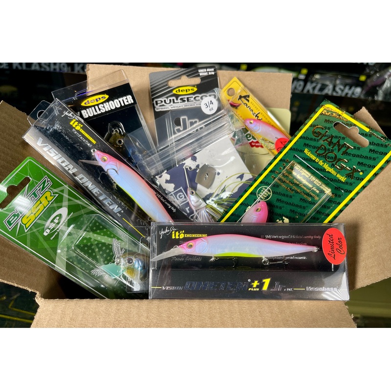 Each box contains roughly $200 of tackle including the one-off exclusive limited color Frozen Pink Chartreuse in the Megabass Ito Vision 110, Karashi, 110+1 Jr and Giant Dog-X – plus these other exclusive custom baits: Deps Tiny Bull Shooter in Esa Gill, OSP Blitz SSR in Esa Gill, Teckel Drunker in White Walker, Deps Pulse Cod in Morning Dawn, and Grass Piece in Sakura Shad.