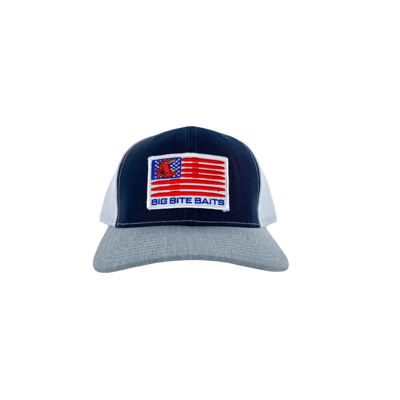 Custom Big Bite American Flag patch featuring our trick sticks on high quality hats at an affordable price. Available in two colors.