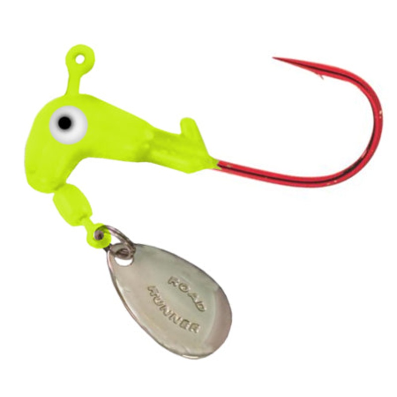 Barbed Road Runner Heads feature a Bleeding Bait Hook, Indiana blade and a collar barb to hold soft plastics. Barb can be easily removed for smaller plastics.