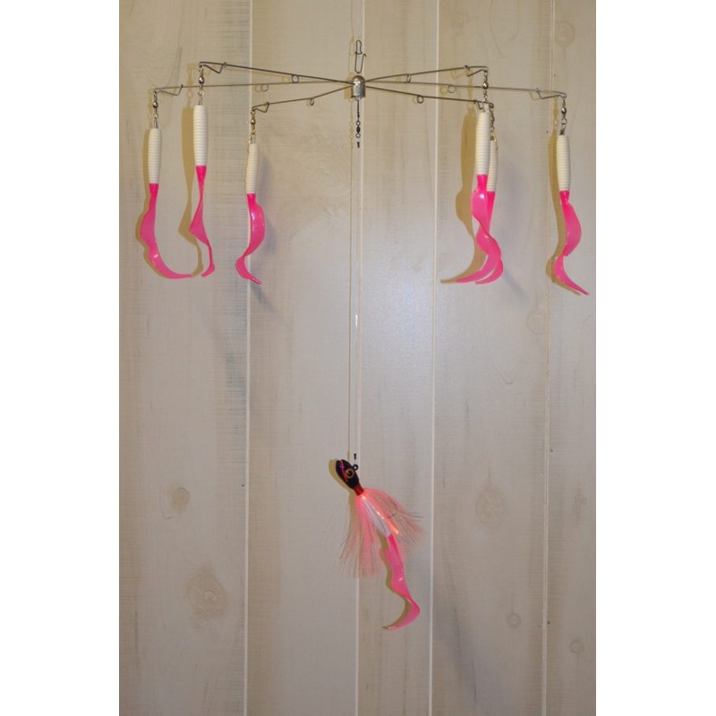 WHITE: White Jig/White Grubs CHARTREUSE: Chartreuse Jig/Chartreuse Grubs PINK ON PURPLE: Pink on Purple Jig/White w/ Pink Tail Grubs Features: Umbrellas made with an 8 swirl tail grub on the end of each arm 3oz. jig skirting an 8 swirl tail grub trailing d