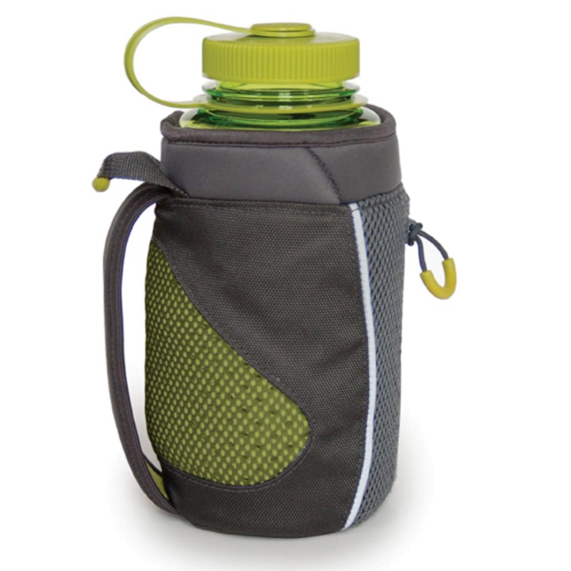 Bottle carrier with hand strap and zippered pocket for 32-oz bottles.