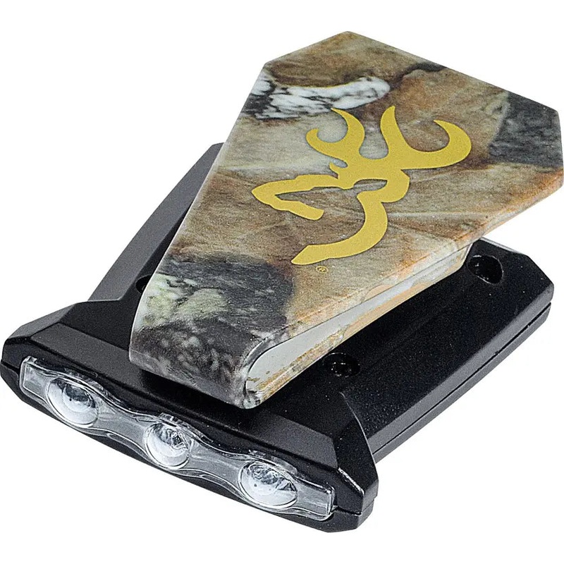 A simple and effective LED light that clips onto the bill of a hat and can be angled up and down. Impact and water resistant. Black body with Vista camo clip.