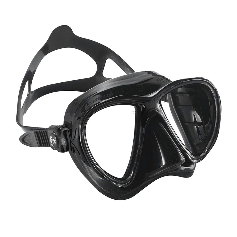 The headband uses the exclusive patented Cressi system of double injection of an elastomer on a rigid element and allows the buckles of the strap to be mounted on an indestructible elastic element that tilts on a vertical plane and can be completely bent sideways on a 180curve. The thickness of the headband has been reduced to such an extent as to make it practically invisible when the mask is being worn.