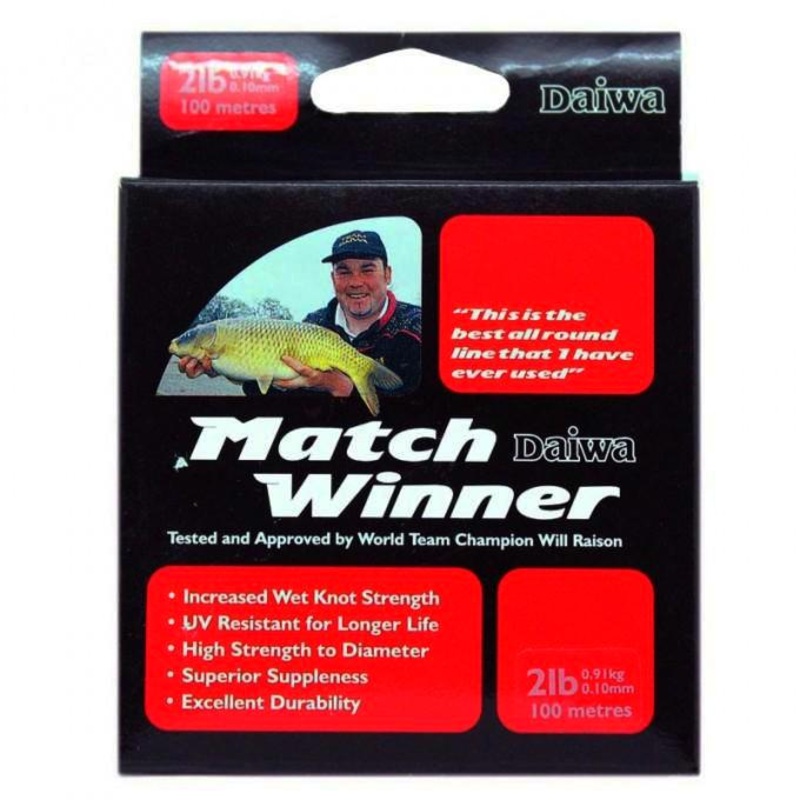 Daiwa Matchwinner Line 100m, this line was developed in consultation with former World Champion Will Raison, it has a very high strength to knot ratio and up to 30% stronger wet knot strength. It was originally designed as a line to be used on a rod and re