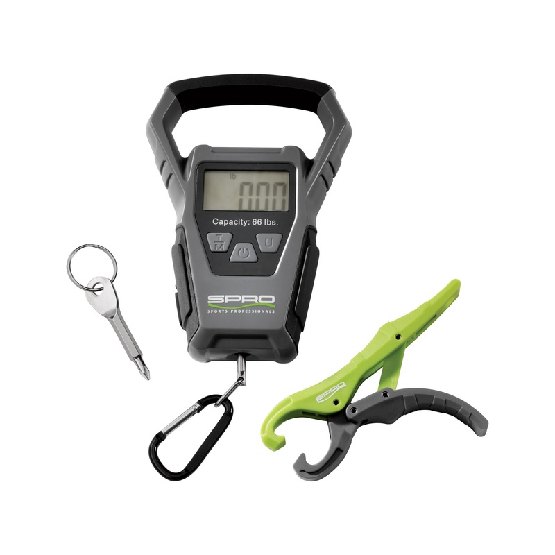 TheSpro Digital Scalefeatures a large easy-to-read LCD screen on the front and a hefty handle. Measuring up to 65lbs and comes with a fish gripper and a built-in 40-inch measuring tape, the scale is simple to use even when trying to bring in that trophy bass.