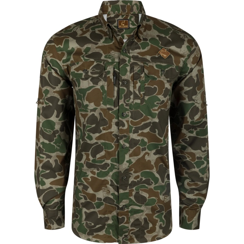 We took our heritageWingshooterand gave it a complete overhaul.We constructed the Trey out of a silky 95% Polyester and 5% Spandex fabric.The performance fabric is lightweight at95GSM which allows moisture to wick quickly from the body.It also has a UPF30 rating for sun protection and has a natural stretch for ease of movement.The Ol’ Tom CamoWingshooterTrey has a classic fit, a hidden button-down collar, two button-through flap chest pockets, and a vented cape back along with a laser-punched vented back.The pocket system includes a hidden zippered pocket on the right and aMagnattachclosure behind the left pocket. It has a sculpted hem which allows you to wear tucked or untuckedand has an adjustable tab if you want to roll up your sleeves.Inside the hem is a built-in sunglass wipe. We took a classic and added a ton of technical features, creating a new Ol’ Tom standard in performanceshirts.