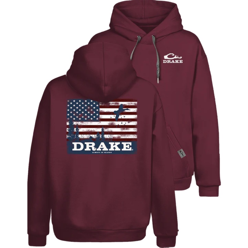 The Drake Sweatshirt Hoodie is constructed with a 60% cotton and 40% polyester blend which supplies softness and comfort. The hood has an adjustable drawstring, the front has a traditional kangaroo pocket, plus we added side panels foradditionalstretch. The Drake Merica has the Drake Logo on the front and the Drake Americana Scenic graphic on the back. From our Drake Sweatshirt Hoodie Series.