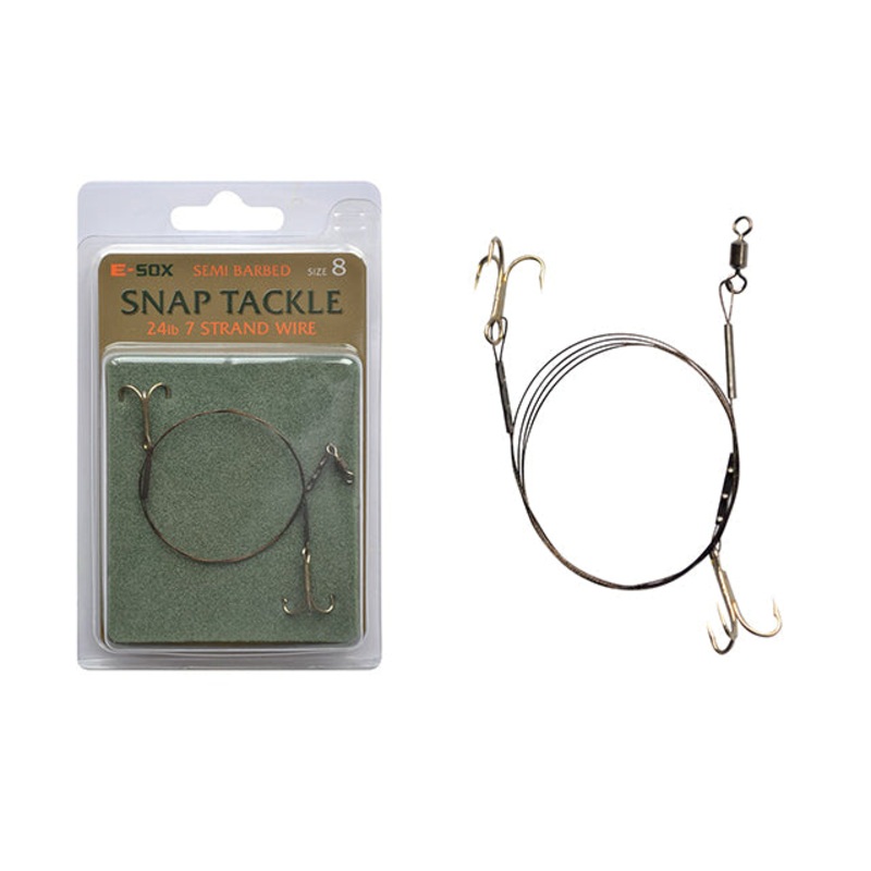 They incorporate strong treble hooks in sizes 6, 8and 10 and in achoice of Barbed or Semi Barbed varieties. Each E-Sox Snap Tackle trace is 40cm long and made from reliable 24lb stainless steel 7Strand wire with slim crimps securely attaching the treble ho