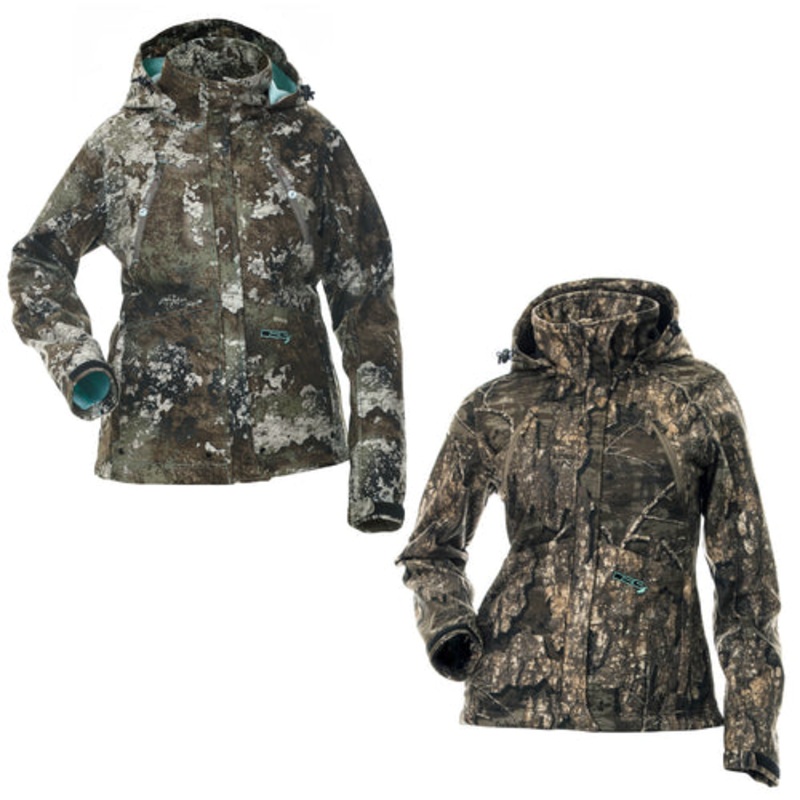 The DSG soft shell hunting jacket comes in 3 Realtree patterns: Realtree Edge, Realtree Excape and Realtree Timber.The quiet micro tricot outer layer is bonded to a micro fleece (aqua) inner layer, creating a wind-proof barrier on this women's jacket for a