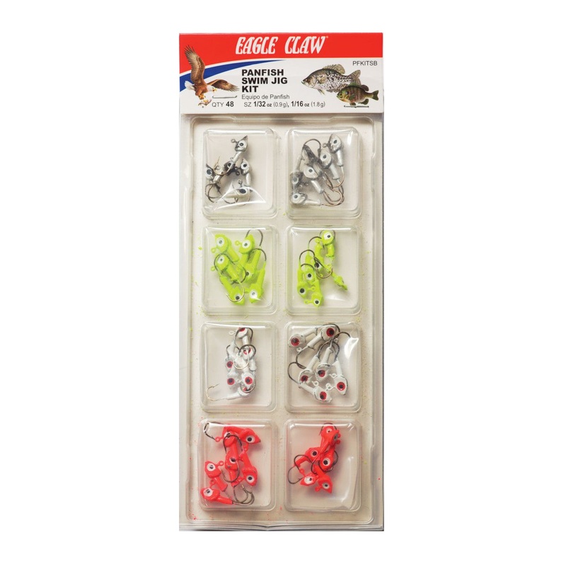 Features: The Eagle Claw Panfish Swim Jig Kit is a 48-piece assortment of fish head shaped panfish jigheads. Enable a wide variety of presentations in pursuit of panfish such as crappie, bluegill, perch, sunfish, and more. Color contrasting painted eyes. M