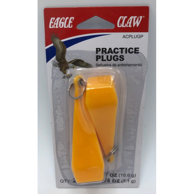 Description Make your casting motions spotless with the Eagle Claw Practice Plug! This superior practice casting plug comes in two sizes - 3/8 oz and 1/4 oz - to ensure you get the most accurate practice session. Develop your skills during your fishing pra