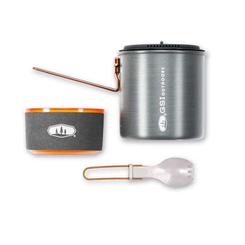 Crushproof, heat-resistant nylon lid includes an integrated strainer and doubles as a Sip-It lid for the mug. Folding handle locks into place for cooking and secures entire set for transport. Welded stuff sack holds set while traveling and doubles as a sin