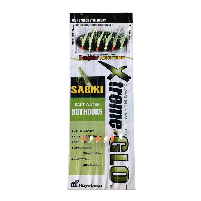 HAYABUSA SABIKI BAIT JIG Size 10 EX101 - Gold Hook / Hage Green Fish Skin Hayabusa Sabiki Bait Rigs are multiple (6) hook arrangements that are ideal for catching fish quickly and effectively. Anglers all over the world have many reasons to love Sabiki Bai
