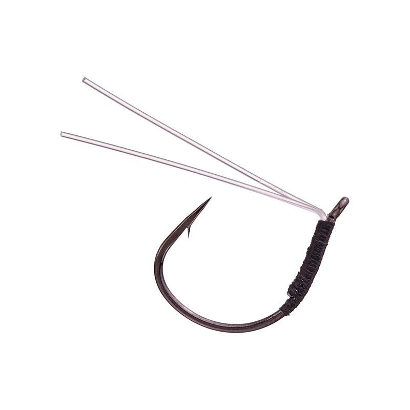 Designed specifically for wacky-rigging soft plastic worms, the Hayabusa WRM201 Fluorocarbon Guard Wacky Hook allows anglers to fish a wacky style bait without worrying about hanging in heavy cover. Engineered with a medium heavy wire and wide u-shaped gap design, the Hayabusa WRM201 Fluorocarbon Guard Wacky Hook provides plenty of space between the worm and the hook shank to deliver superior hook penetration and lightning fast hook-sets. The innovative fluorocarbon weedguards are also tied to a perfect tension, which keeps the hook off of cover while allowing it to penetrate a fish with a solid pull of the anglers rod. The fluorocarbon guards are extremely resilient and will keep their shape after catching multiple fish as well. Finished with a needlepoint for unmatched sharpness, the Hayabusa WRM201 Fluorocarbon Guard Wacky Hook is the best heavy cover wacky hook built to target and catch big bass.
