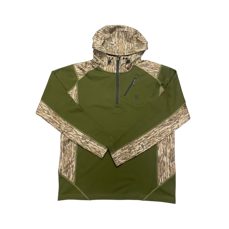 The Heybo Outlaw Hoodie is constructed of super soft and warm hex fleece technology. This hoodie is a multi-functional piece that is super quiet and can be worn alone or under another jacket. Featuring thumb holes and an adjustable hood, the Outlaw is perfect for the bow stand, the duck blind, and the dove field. Olive hoodie accented in Mossy Oak Bottomland camo.