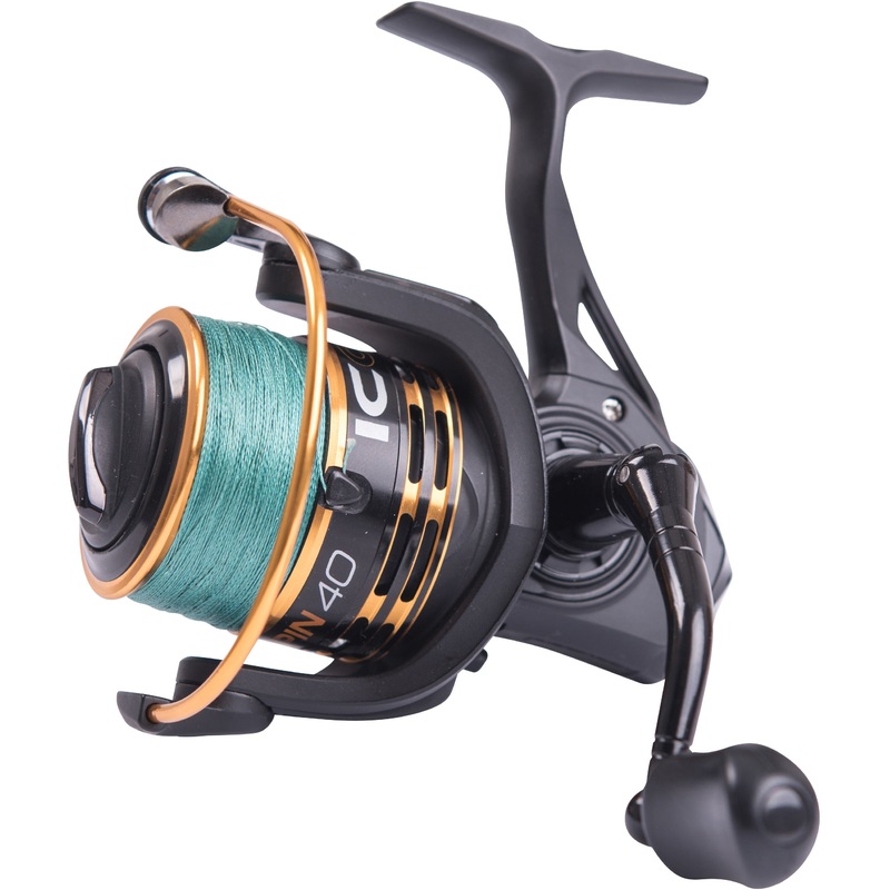 • Compact Spinning Reel 5+1 Ball bearing. Anodised spool .Thick diameter bail arm with anti twist line roller CNC handle with rubber grip knob Adjustable Front drag system 5.5:1 Gear Ratio Loaded with 20lb Braid Ideal accompaniment to the ICON Spin rods A3208 & A3209