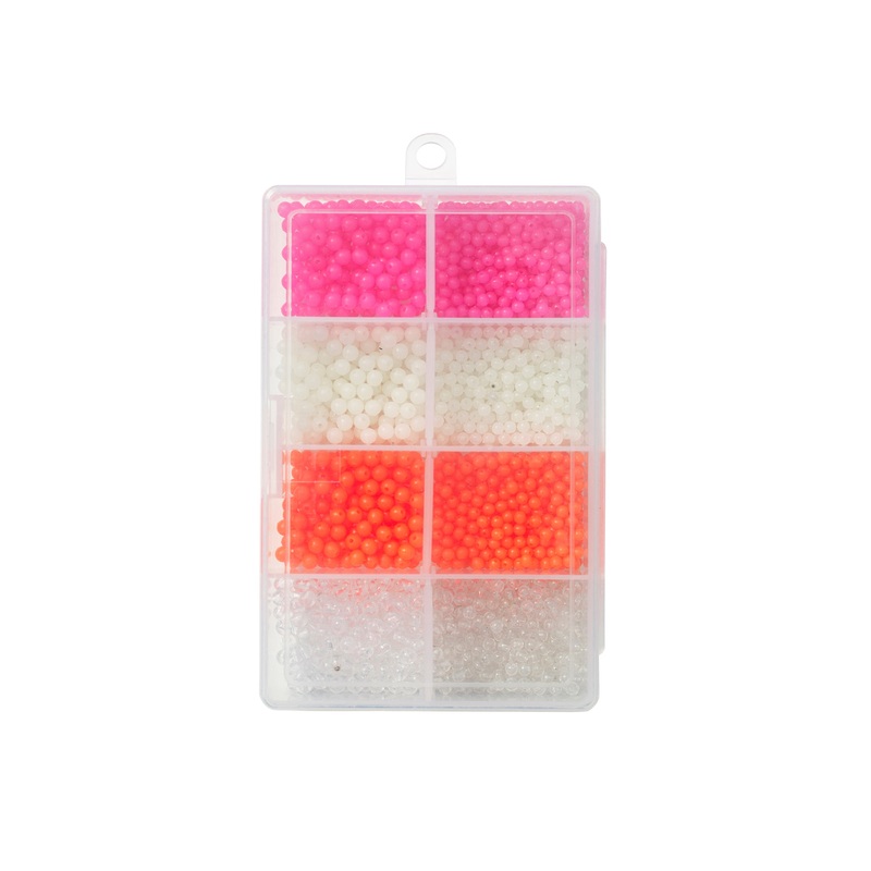 This bead mix of popular attractors lets you pimp your favorite inline lures or make your own rigs with a perfect mix of popular saltwater rig colours and sizes. Round shaped ABS beads in 4 colours Colours: Pink / Fluorescent Orange / White Glow / Clear Si