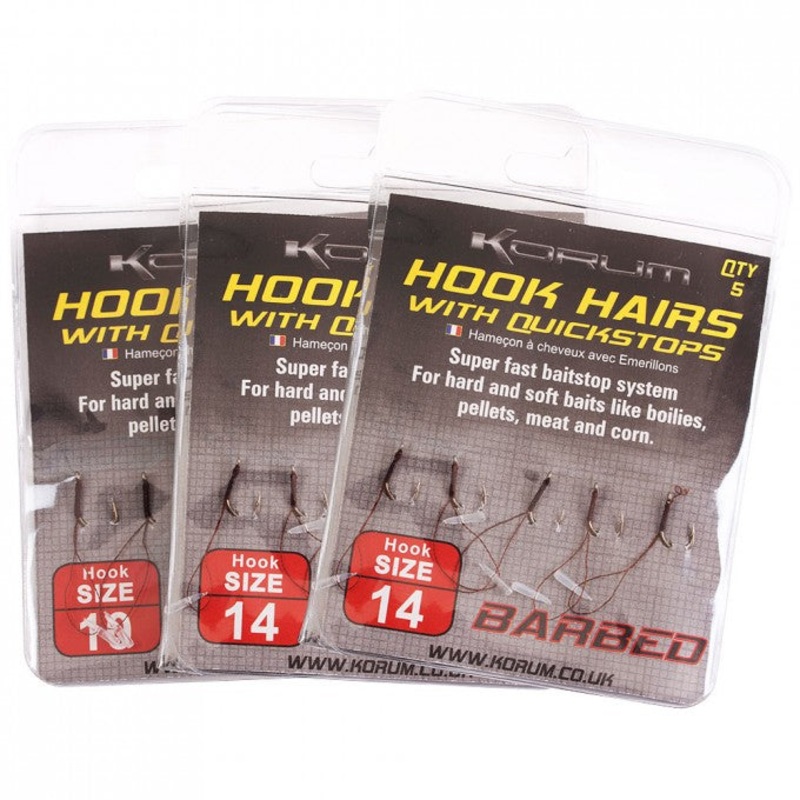 This super fast bait stop system comprises a high quality eyed hook tied braid hair and Quickstop. Perfect for boilies soft pellets meat and corn making fishing with a hair rig and mounting a bait ultra simple. The barbed version has been designed for anglers who prefer barbed hooks when fishing for barbel chub tench bream and also for carp. The small barb gives more security especially in situations where fish may get weeded.