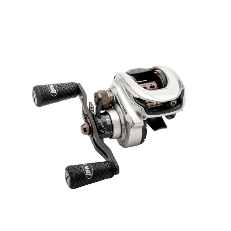 Continuing to push the limits of innovation and performance, Team Lews has redesigned the HyperMag baitcast reel to enhance not only function, but experience. The HyperMag baitcast reel includes the P2 Super Pinion double bearing supported pinion gear, offering a better gear mesh for smoothness and extended gear life. The ergonomic one-piece magnesium frame and C40 carbon sideplates are strong and extremely lightweight, with the reel weighing in at only 5.2 oz. The barely-there feel of this reel is ever-present, giving anglers the comfort and control they desire. The features dont stop there the recessed brake adjustment dial contributes to the low-profile design, the Speed Knot quick line attachment spool enables easy and quick line attachment, and the JDM-style Winn handle knobs provide outstanding grip and comfort. In line with the original, the new HyperMag has a 4-pin SpeedCast externally Adjustable Centrifugal Brake (ACB) system, 11 bearing system, Speed Keeper hook keeper, and Speed Dial line indicator, bringing all of the best features together in one of Lews lightest, most efficient baitcast reel to date.
