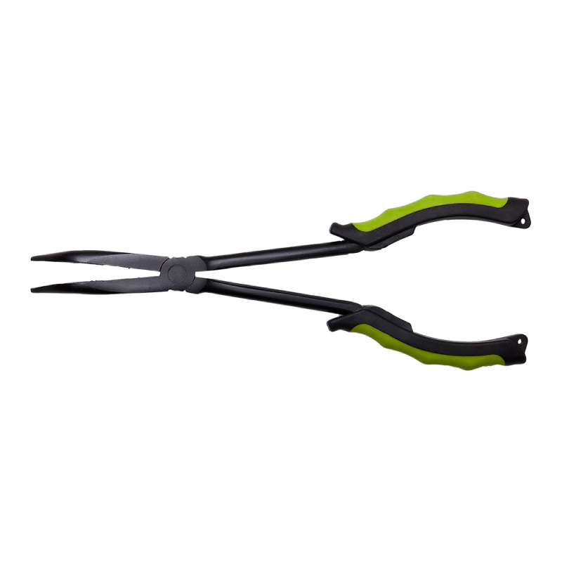 Extra-long unhooking pliers (28cm), made of hi-carbon steel, with a PTFE coating. With curved jaws, ideal to reach and turn hooks deep inside the fish mouth. Executed with anti-slip handles.