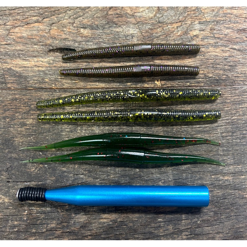 Kit includes: 1 O-Wacky Tool, 2-Case Watermelon Red Flake O-Wacky Jacks, 2-Case Watermelon Gold Flake Big Magic Stiks and 2-Case Green Pumpkin Purple Flake Magic Stiks.