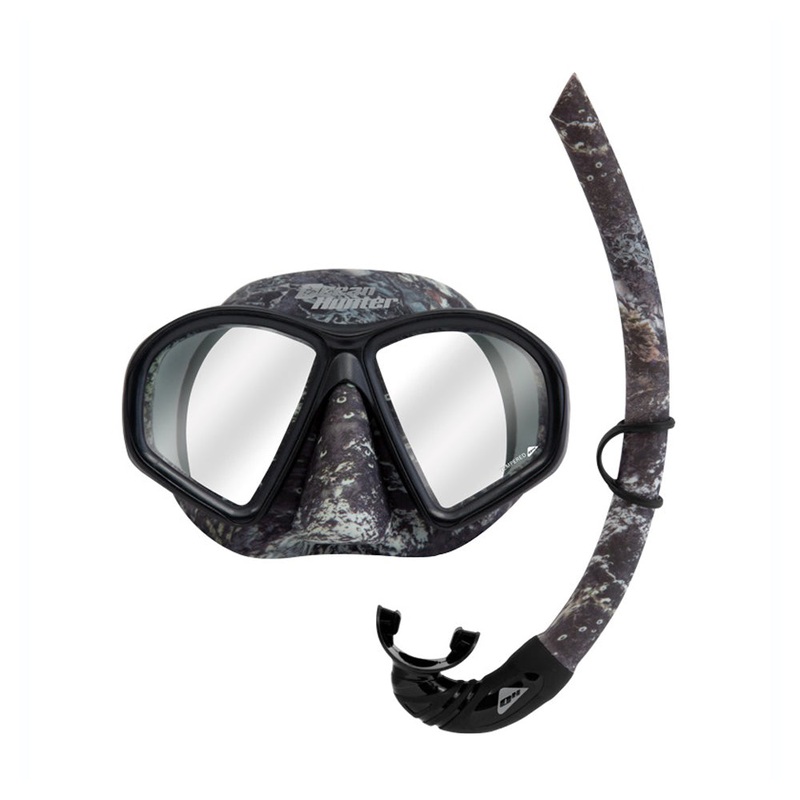 Pairing our ever-popular Ocean Hunter Phantom Spearfishing mask with the Phantom Freediving snorkel. This is a perfect set for both recreational freediving and spearfishing at any depth. The satin camouflage finish eliminates reflection on the skirt and snorkel which reduces the chances of fish noticing you when youre hiding on the bottom. The mask features a large tempered glass lens and a low volume soft silicone skirt. The snorkel has an ergonomic shape and comfortable mouthpiece. The snorkel contours to your face and head reducing vibration and drag during the dive.