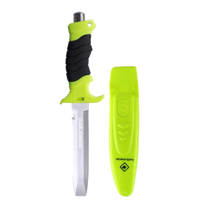 The Ocean Pro Shuka Abalone knife is perfect for prying off abalone from the rocks.The package comes with a line cutter, hammer butt, 'Sure Lock' case, leg/arm straps, and a nice bright fluoro yellow colour to increase the chances of recovery upon dropping