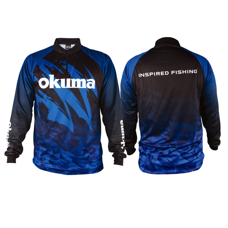 Okuma branded UPF 50+ fishing jersey constructed from lightweight, quick dry material and featuring a collar, front zip and long sleeves.