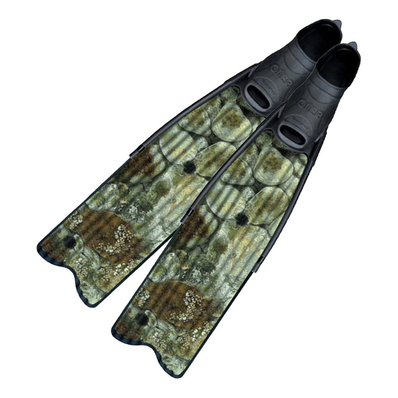 These are the camouflage version of the traditional Omer Stingray fins, which are a little stronger than the black version. The 3D camouflage pattern is achieved by putting a film, with the bottom sea picture, directly on the blade during the moulding proc