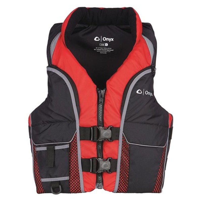 Soft, fleece lined, fiber-fill collar Large mesh storage pockets Fleece lined handwarmer pockets Reflective material on front and back Two zippered chest pockets; pliers pocket D-ring attachment for small accessories U.S. Coast Guard approved ITEM #117200-