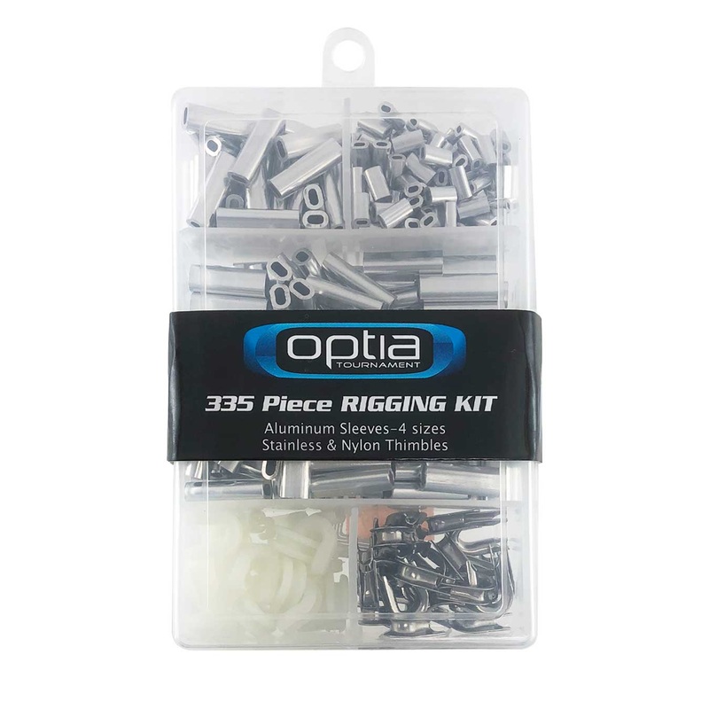 The Optia 335 Piece Rigging Kit is a crimping kitwith 4 sizes ofaluminium single sleeves and 2 types of thimbles. Pack includes: 150 x 1.2mmAluminium Single Sleeves 35 x 1.7mm Aluminium Single Sleeves 50 x 2.0mm Aluminium Single Sleeves 50 x 2.3mm Aluminiu