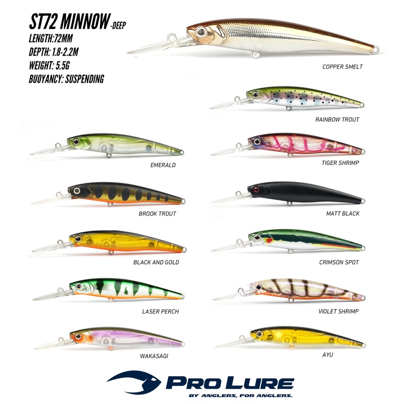 PRO LURE ST72 MINNOW – DEEP|Black and Gold|Brook Trout|Copper Smelt|Crimson Spot|Emerald|Laser Perch|Matt Black|Rainbow Trout|Tiger Shrimp|Violet Shrimp|Ghost Wakasagi|Ayu|Smelt