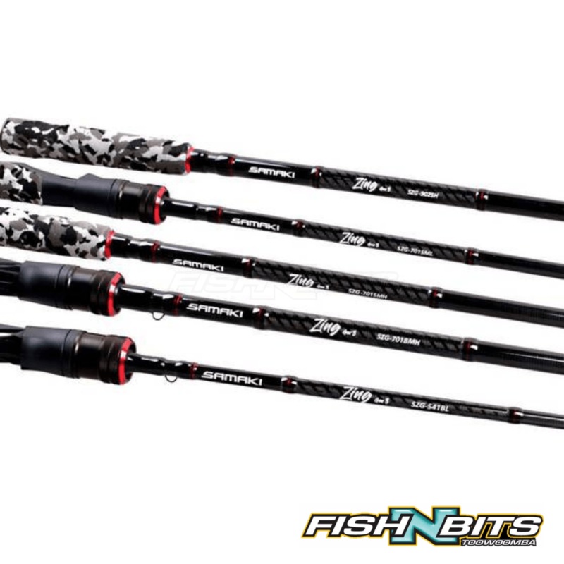 The Samaki Zing Gen 3 is a lightweight series of spinning rods which upgrades and refines the old Gen 2 models. It uses Samaki's Hyper kinetic graphite blanks, and a custom ergonomic reel seat to reduce casting fatigue. Along with the ultra hard camo EVA g