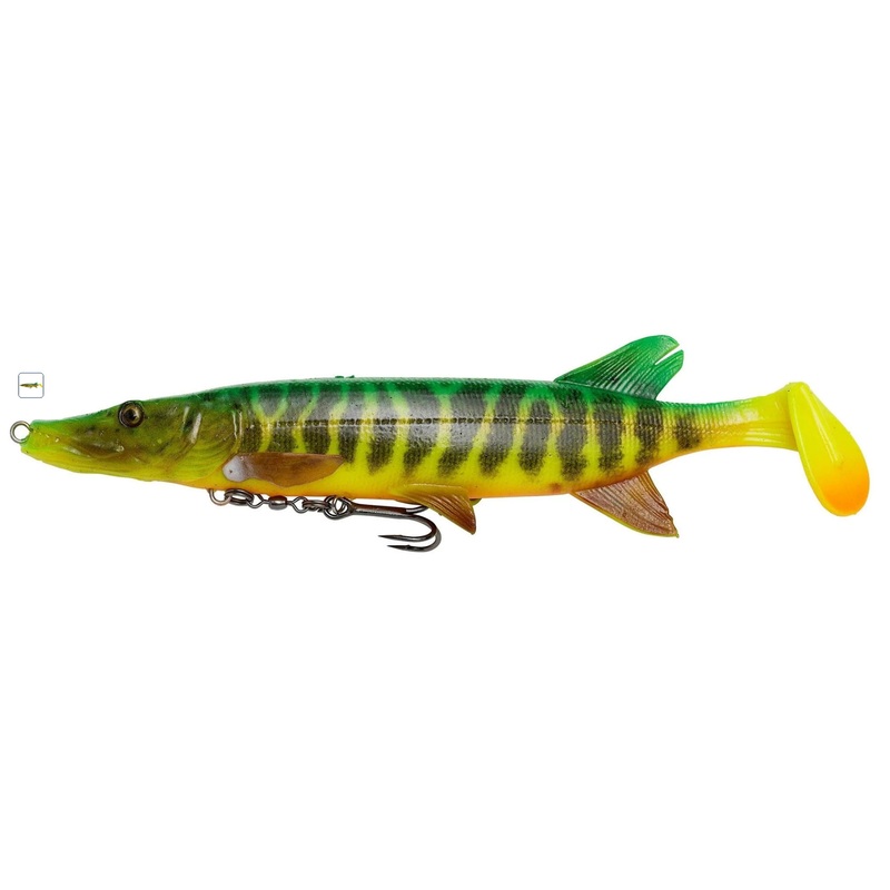 Based on a 3D scan of a real baby pike with perfect details, Photo Chrome skin print and added DNA scent this lure will fool you, let alone the fish youre trying to catch. Small jacks are the favorite prey for big pike at certain times of year, and these super realistic lures will be deadly when the time comes. The belly-mounted treble hook is attached to a swivel, making it very difficult for a pike to throw the hook during a fight. The paddle tail makes the lure rock seductively and the rattle in the tail sends out provoking clicks to draw in curious predator fish.