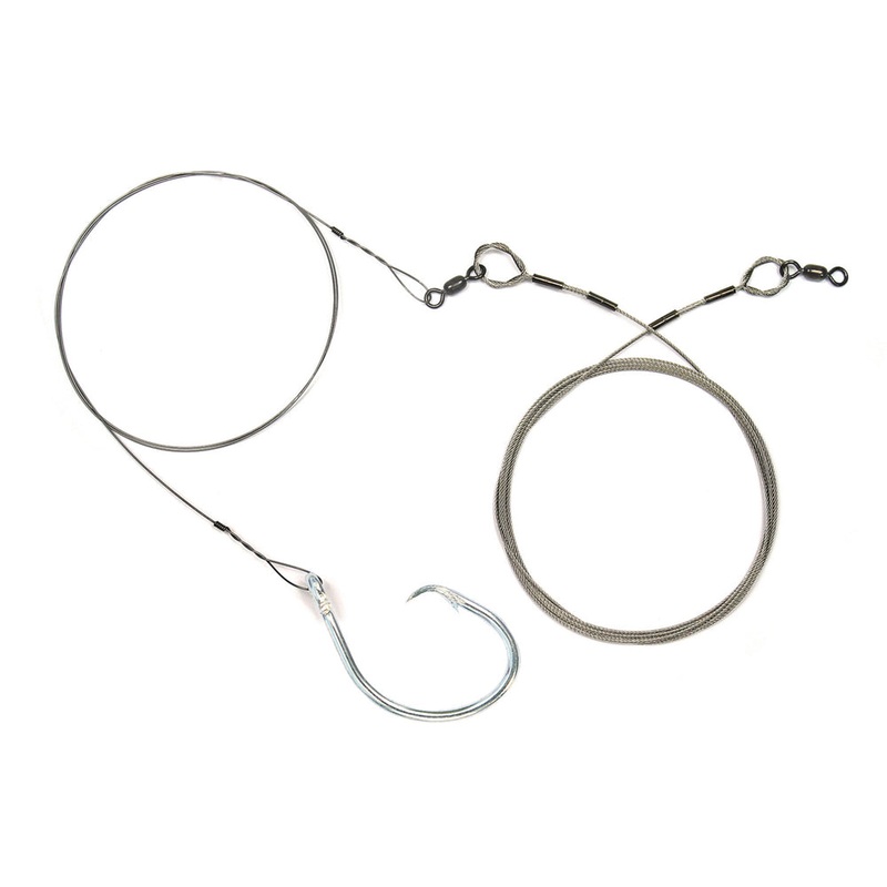 Shark rigs made with 9′ 480 lb. stainless steel cable and crimped with double Billfisher sleeves. The 9/0 and 10/0 rigs are made for smaller and mid-size sharks. The 12/0 and 13/0 rigs are for the serious shark fisherman with 4′ of solid stainless wire attached to the cable. The wire will slip between the shark’s teeth and he is unable to bite that part of the leader.