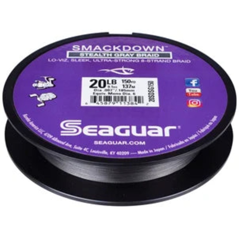 Seaguar Smackdown Lo-Vis Stealth Gray 8-Strand Performance Braid Thinner Diameter, No Stretch, Ultra Strong and Abrasion Resistant, Super Sensitive,Less Visible. Made with 8 ultra-thin, micro-weave strands, woven into a perfectly round profile for quiet la