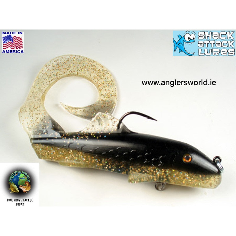 Shack Attack Curly Sue Softbait Lure - Black & Gold GllitterSize : 11"The 6" Curly Sue is perfect for times when predators are chasing smaller meals.The 11" Curly Sue proved it's self in the last few weeks of the 2007 season. In this short time there were