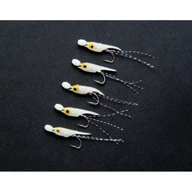 Mini glow in the dark shrimp rig with flash sparkle tail. 5 hook rig.