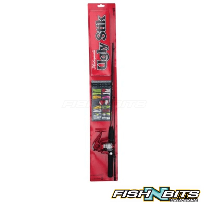 Shakespeare fishing equipmentDesign: Ugly Stik Complete Spincast KitPack contents:Ugly Stik rod (2 piece)Pre-spooled reel2 x 3" chartreuse grubs2 x 3" white grubs2 x 3" yellow grubs2 x chartreuse tubes2 x red and white tubes4 x swivels10 x split shot weigh