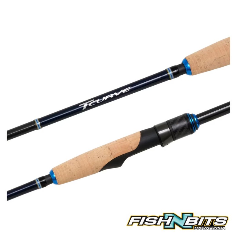 Shimano T-Curve rods, featuring advanced Armour 40-5 blank technology for optimal strength and reduced weight. With 13 models, these rods offer KR Alconite guides, improved Fuji reel seats, and comfortable EVA and cork grips. Sleekly designed with a black finish and dark blue gradient, an upgrade to one of the most classic rod series in Australian fishing.