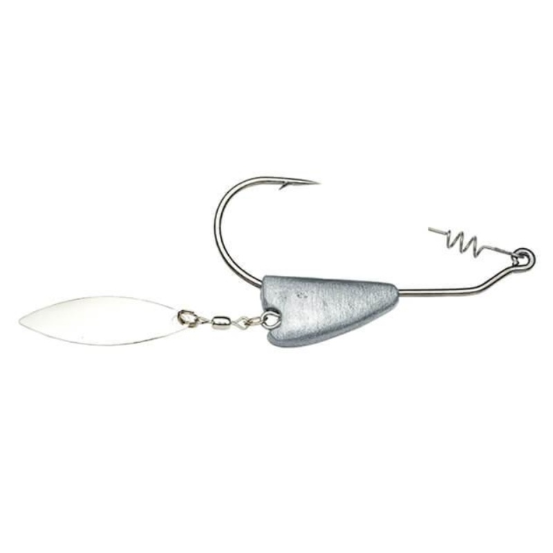 Jazz up your favorite soft swimbait by pairing it with a Strike King Tour Grade Belly Blade Jighead. This pro-designed system is not your typical underspin setup at all, as the jighead itself is actually a weighted keel that rides ahead of a Strike King Raz-R-Blade willow blade, connected via a ball-bearing swivel. The unique rigging keeps your bait running upright and produces extraordinary flash without twisting your line, whether you’re slow-rolling in deep water or slicing through shallow cover. The keel weight shields the blade, making the Belly Blade virtually weedless. Screwlock keeper for secure bait attachment; black nickel needle-point hook.