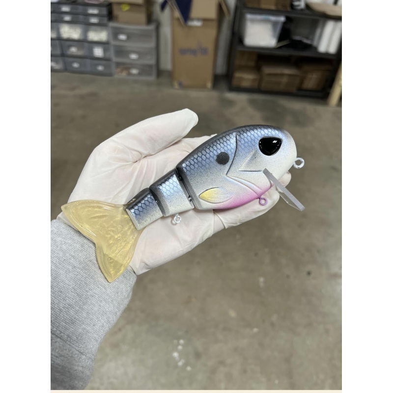 This unique wake bait allows you to utilize an enticing wake/crank action. The unique body profile allows a crawling action from the 3 piece body and large tail. The tail is a dense soft plastic that is kicking with the smallest of movements. One bait per household.