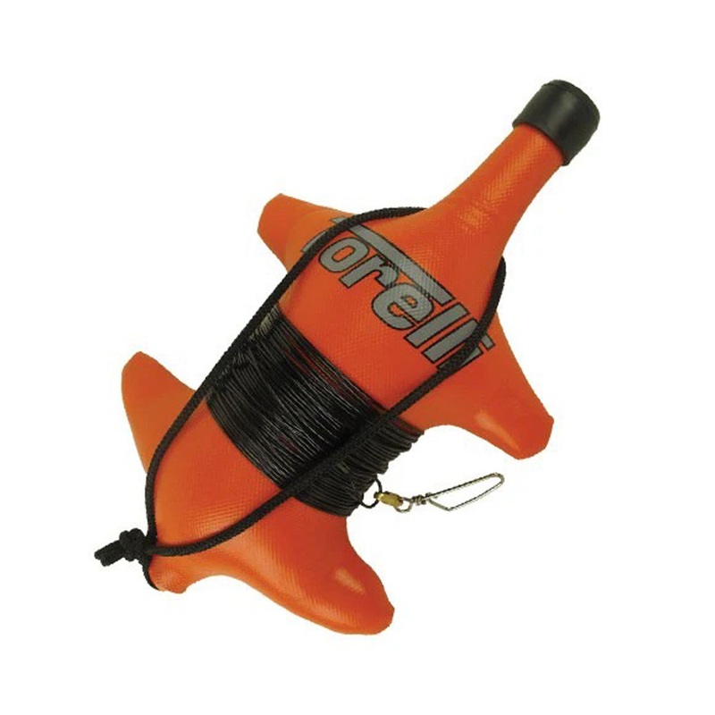 Highly visible Orange foam blown vinyl skin float with unique shape to allow easy storage, deployment and retrieval of Flasher. Comes rigged with 400lb mono and clip to attach flasher. Elastic retainer to secure flasher at chosen depth. Wind the float using the extended handle to retrieve line and raise the flasher.