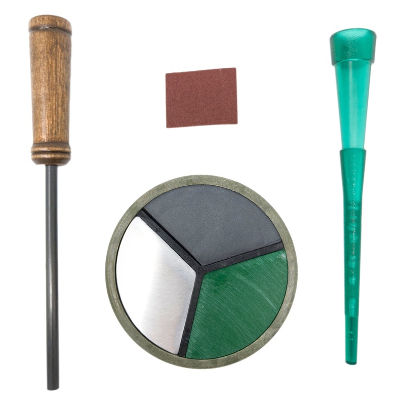 The Triple Threat does triple your chances! This call features 3 calling surfaces in one: slate, aluminum and plexi. You can produce the high-frequency sounds of aluminum, the mellower sounds of slate and the super soft clucks, purrs and tree sounds of plexi. The most complete turkey call available today. Includes cleaning pad.